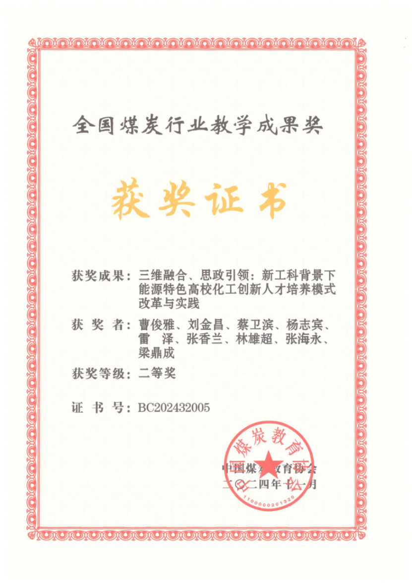 成果名称:三维融合、思政引领:新工科背景下 能源特色高校化工创新人才培养模式改革与实践