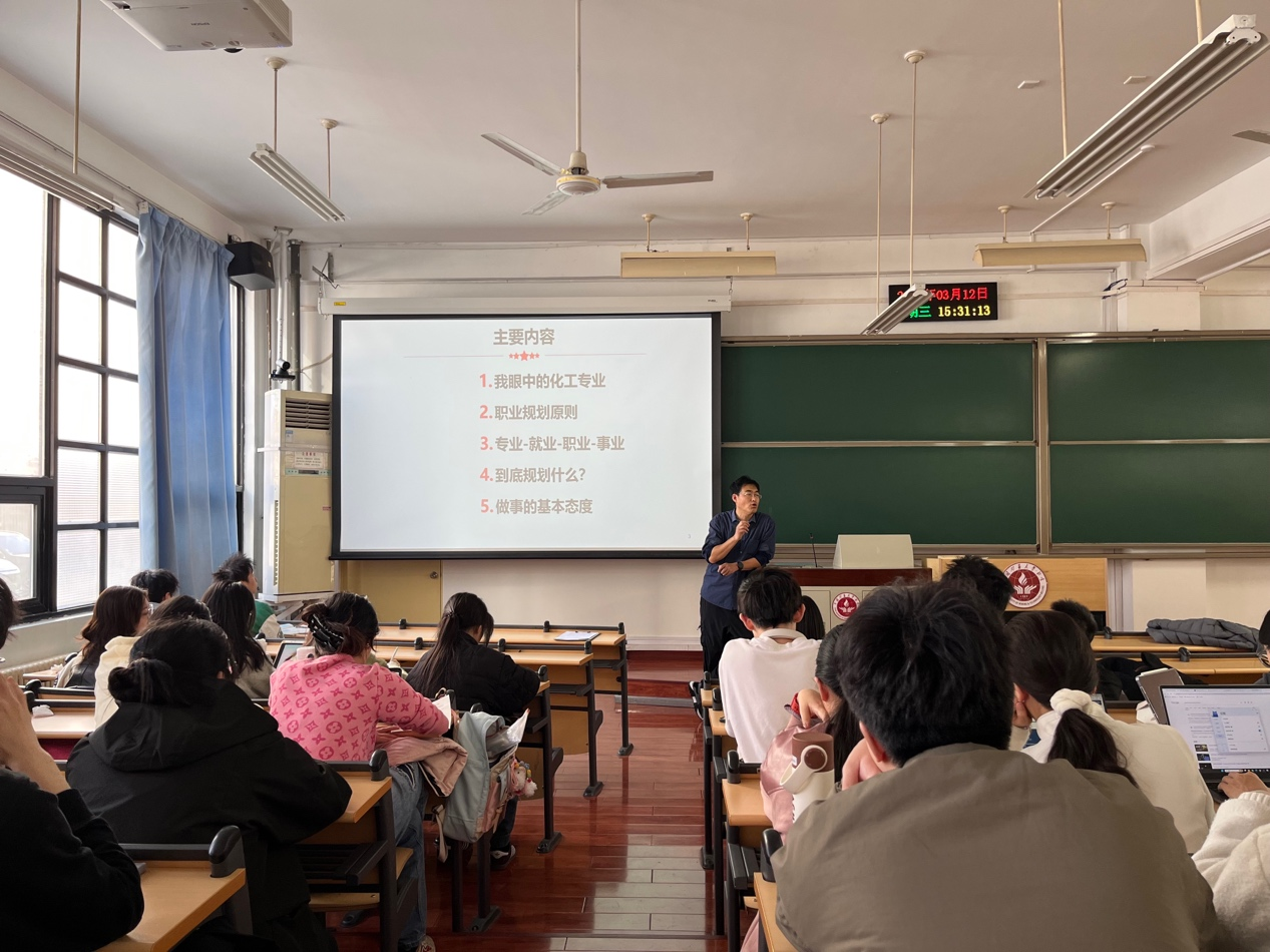 为进一步聚焦《大学生就业指导》课程目标,贯彻落实“校企协同”育人模式,提高学生的就业竞争力,促进学生实现更充分更高质量就业。化环学院特邀业专家走进课堂,剖析当前行业前景,分享就业经验,帮助学生更好思考和把握未来求职方向。3月12日下午,我校科技矿场校外导师中国科学院大学公旭中研究员走进课堂,为化工专业22级本科生带来了一场精彩的就业指导课。
