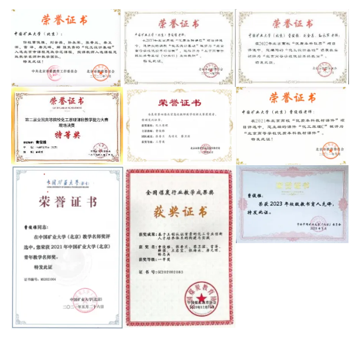 她不断改进创新教育教学方法,教学能力和水平受到校内外广泛认可,先后获评北京市思政教学名师、北京高校优质本科课程主讲教师、校青年名师和教书育人先锋等荣誉称号,在全国化工原理教学能力决赛中获特等奖,在北京市教学创新比赛中荣获三等奖。