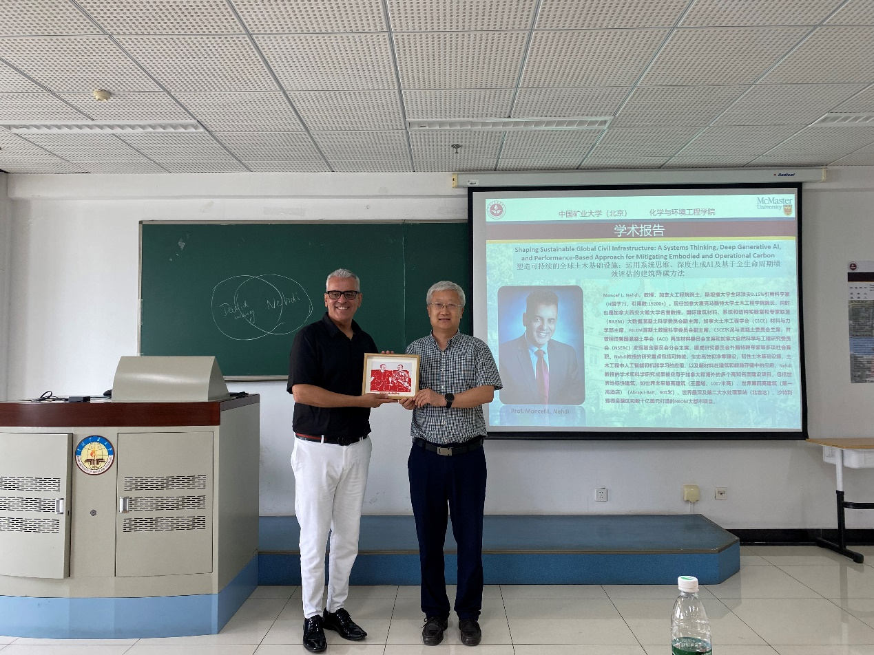 2024年6月22日上午,加拿大麦克马斯特大学Moncef L. Nehdi教授受中国矿业大学(北京)化学与环境工程学院王栋民教授的邀请到访中国矿业大学(北京),并在逸夫楼817作“Shaping Sustainable Global Civil Infrastructure: A Systems Thinking, Deep Generative AI, and Performance-Based Approach for Mitigating Embodied and Operational Carbon(塑造可持续的全球土木基础设施:运用系统思维、深度生成AI及基于全生命周期绩效评估的建筑降碳方法)”报告,王栋民教授主持报告会。