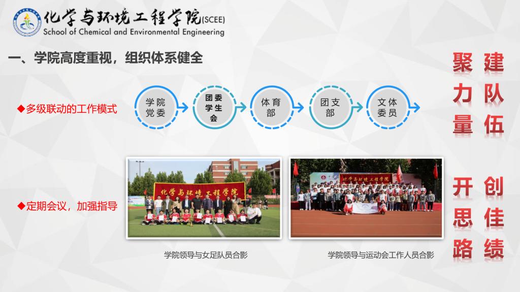 继承发展创新,工作特色突出。一是继承传统,激励精神。化环学院师生体育活动开展广泛,在一些项目上具备强有力的优势,不断凝练的体育精神同时激励师生,在继承中发展,在实践中创新,更好地践行社会主义核心价值观和落实“三全育人”工作。二是完善模式,协作争先。及时进行复盘总结,不断开展实践摸索,建立“化环学院运动队”,以此发现和培养体育骨干,召开专项会议研究工作计划和应急预案,制定训练日程,学生会各部门、各学生干部发挥团队力量、分工协作做好运动会保障工作,确保各项工作落细落小落实。三是培育特色,示范引领。成立“裁判协会沙河裁判小队”带领10多名学生裁判爱好者通过国家二级裁判员考试,这些学生裁判员承担了180余场比赛裁判工作,发挥了示范带头作用,有效促进了体育文化的弘扬。