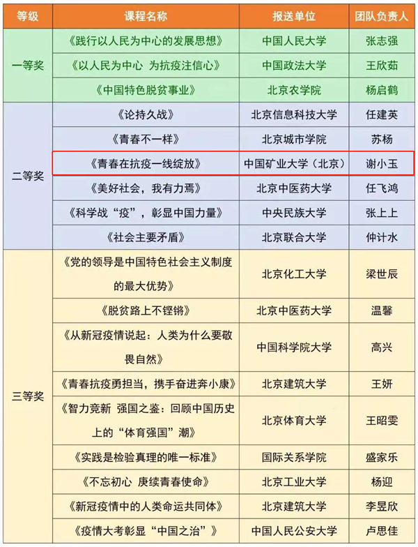 1111日,绽放抗疫青春决胜全面小康”——第四届全国高校大学生讲思政课公开课展示活动评选结果公布,经过专家多轮评审、严格把关,我校选送的公开课展示作品《青春在抗疫一线绽放》荣获北京赛区二等奖。作品由我院环境工程2018-1班本科生谢小玉同学主讲。