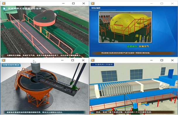 成果四:运用虚拟现实技术搭建了选煤厂车间及工业广场虚拟现实系统,开发了矿物加工设备及过程单元三维动画演示系统,设计并加工制作了选煤厂和设备单元的实体模型,形成了虚实结合的立体化实践教学的新模式。