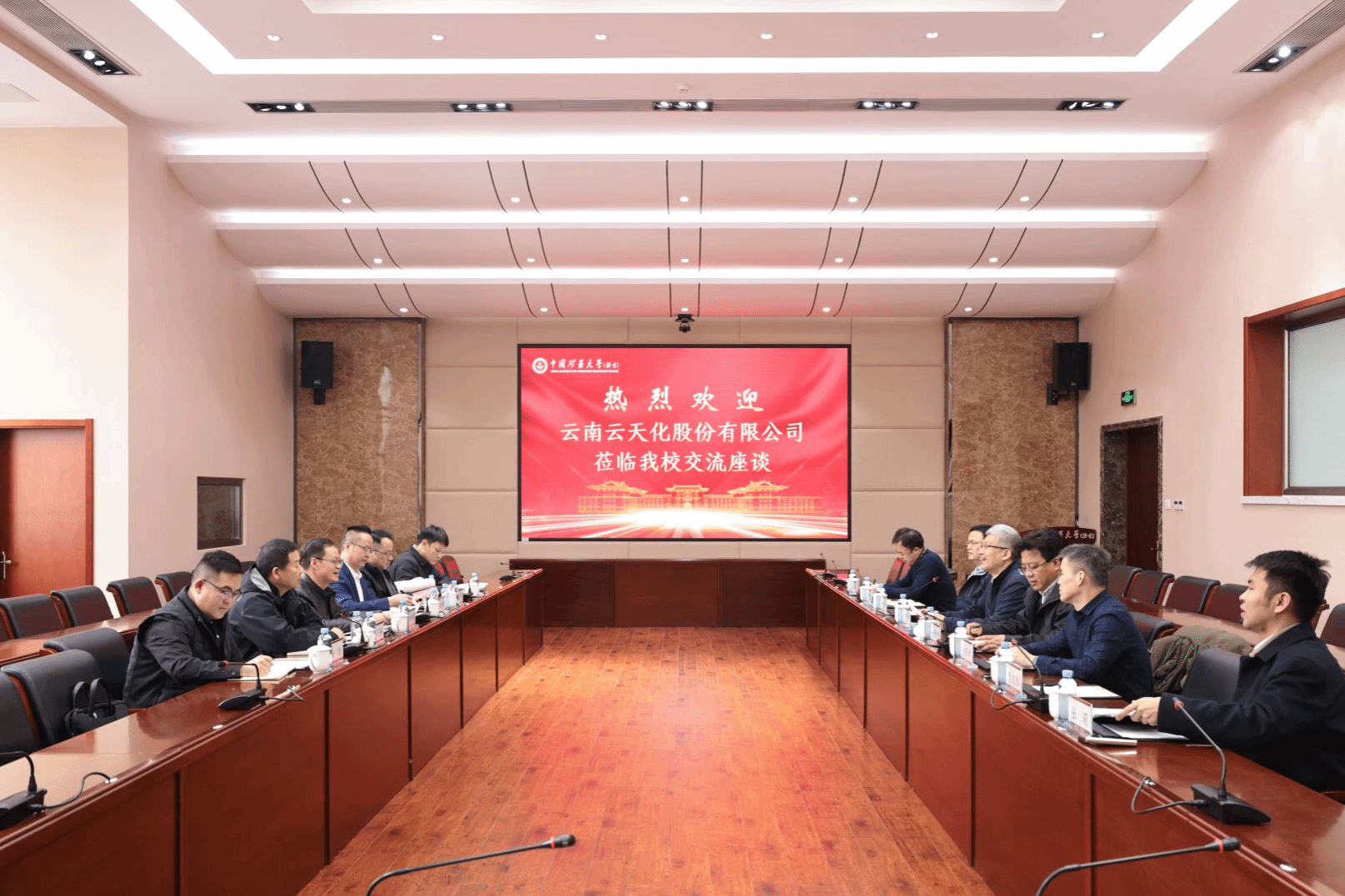 云南中寮矿业开发投资有限公司董事长王国强、副总经理董伟,云南水富云天化有限公司总经理助理杨国成、生产部副经理张振等,学校能源与矿业学院院长杨胜利,化学与环境工程学院副院长(主持工作)邓久帅,地球科学与测绘工程学院、学生工作处、化学与环境工程学院、国家煤矿水害防治工程技术研究中心相关负责人参加座谈。