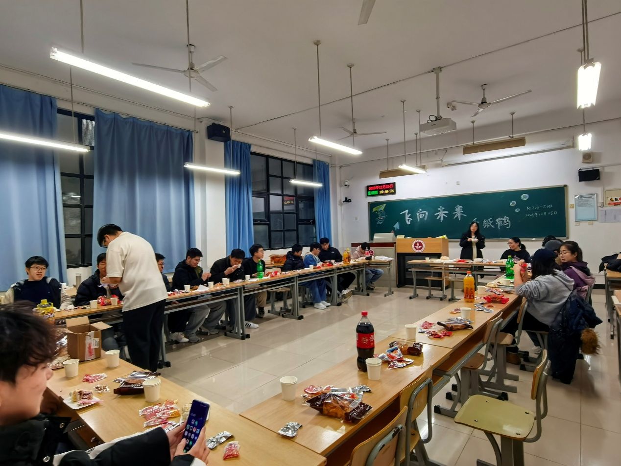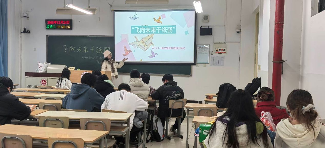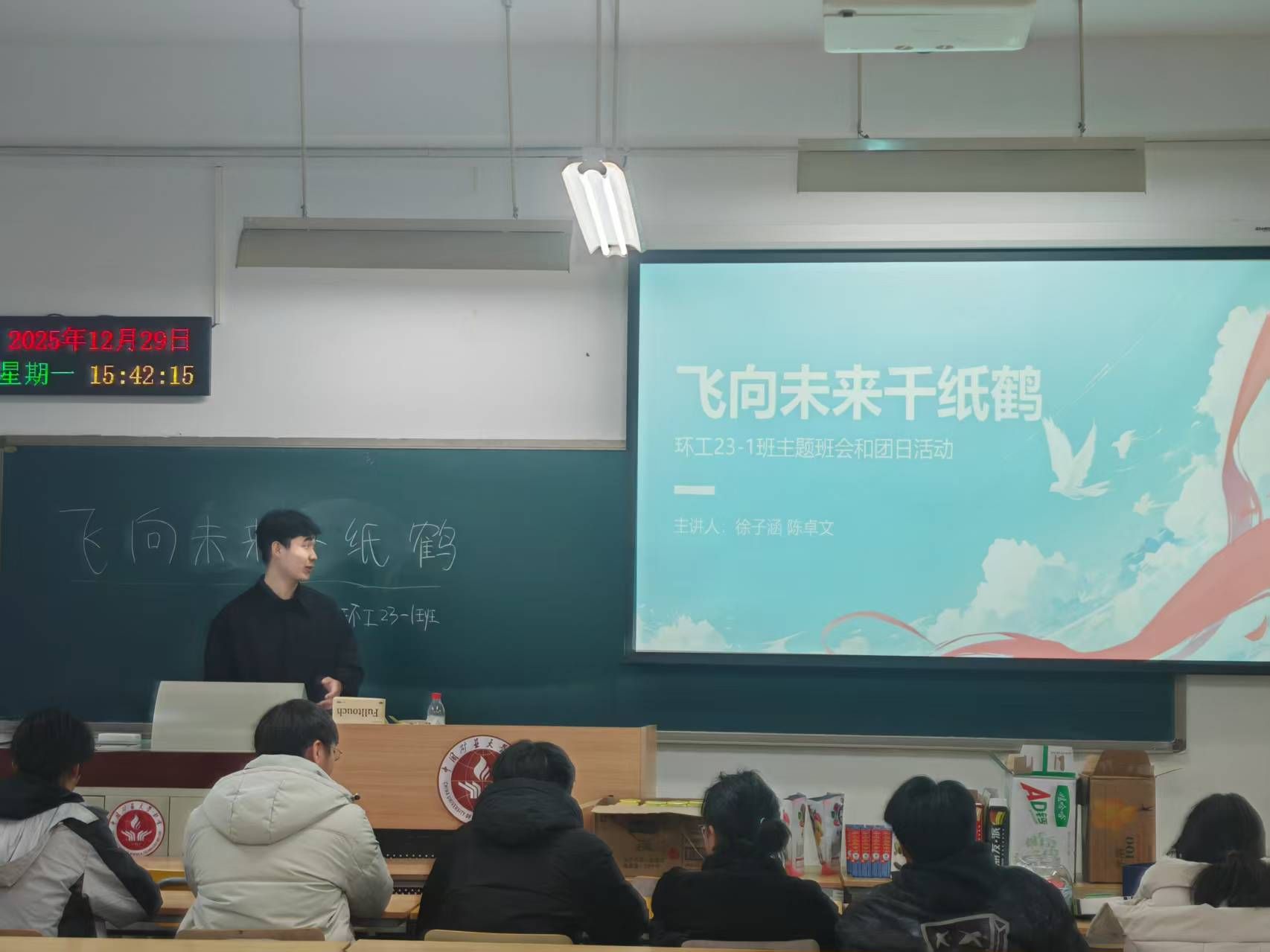 环工23-1班将活动与学风建设、期末动员紧密结合。班会分为主题引领、学风动员和“放飞希冀”三个环节,同学们在彩纸上书写学期目标与未来憧憬,折成千纸鹤并分享个人规划,同时就高效复习、诚信考试等进行交流,活动在零食分享与合影中圆满结束。