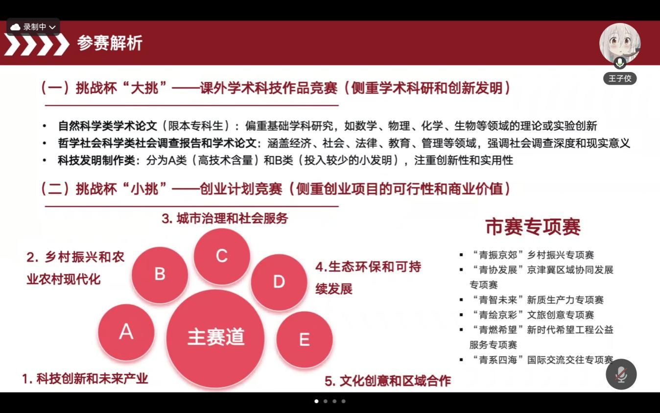 王子佼同学则拆解了“挑战杯”赛制与全流程备赛要点。她指出近年来特别关注的五个社会议题:科技创新和未来产业、乡村振兴和农业农村现代化、城市治理和社会服务、生态环保和可持续发展以及文化创意和区域合作,项目来源可从导师课题、社会热点等方向切入,并详细讲解了从材料准备到全国评审的全流程,鼓励同学们明确参赛目的,敢于表现自我,在实践中收获成长。