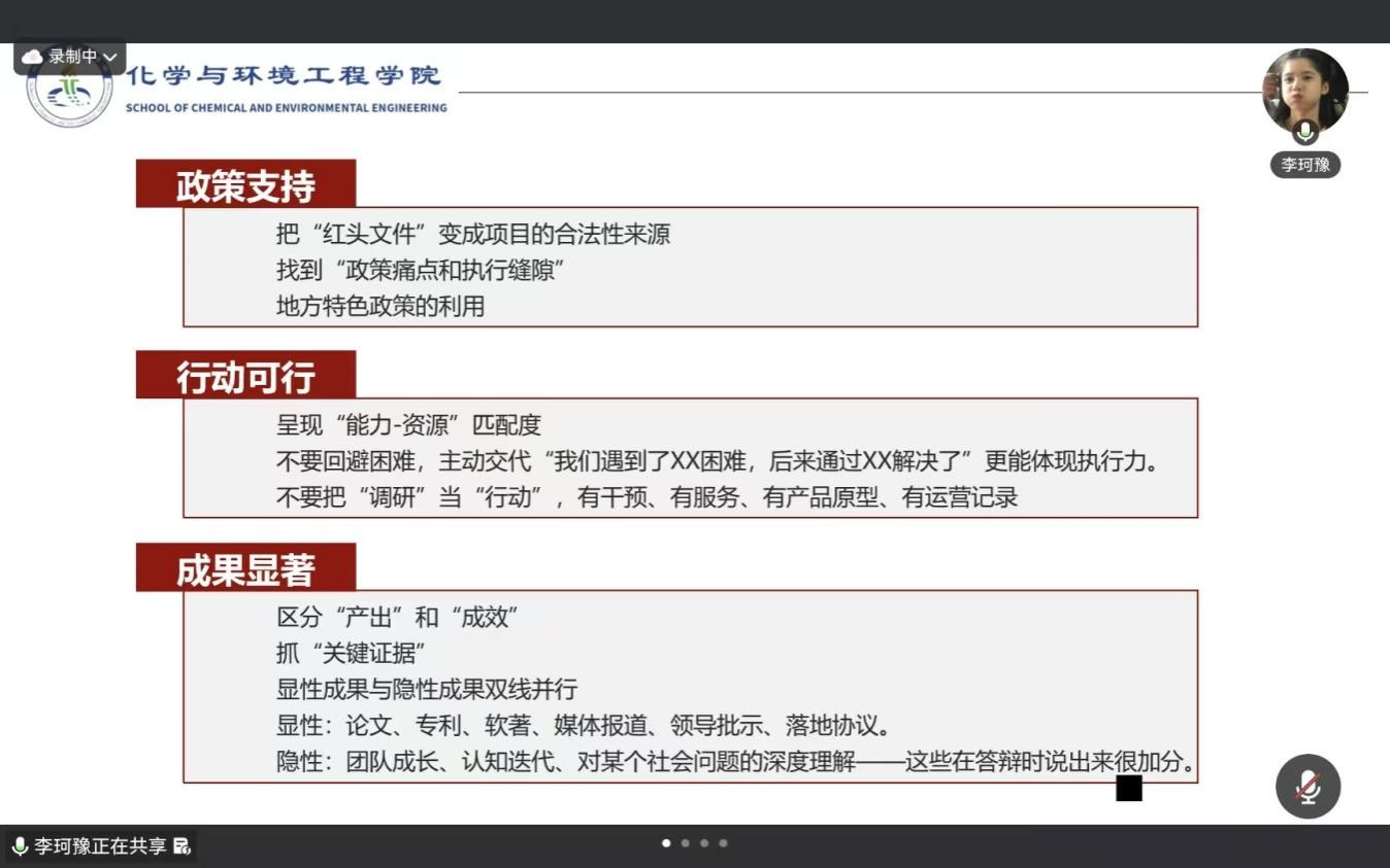 李珂豫同学分享了选题、PPT制作及路演要点。她指出,可以将符合本赛道的比赛或实践成果进行转化,并紧扣“政策支持、行动可行、成果显著”三个核心进行选题,精准引用红头文件,具体问题具体分析,展示团队能力与资源匹配度,用数据和代表性素材体现项目带来的改变。并同时兼顾显性成果与隐性成果,即外界反馈和内部团队的成长认知以及对社会的贡献。