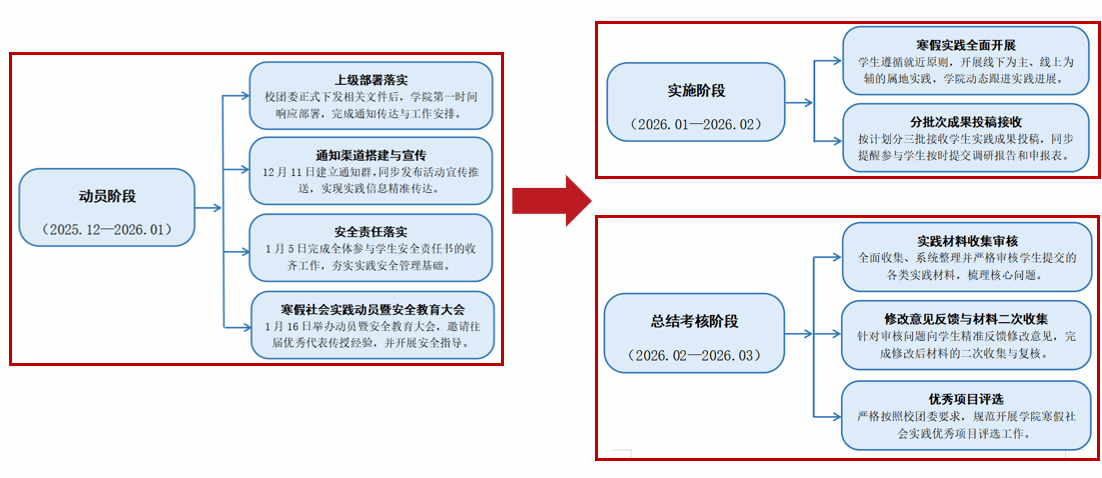 学院高度重视本次寒假社会实践,在校团委相关文件下发后迅速响应,全面统筹、周密安排,确保实践工作规范有序推进。2025年12月高效完成通知传达、安全责任书签订与动员部署,2026年1月至2月顺利完成实践开展以及分批次成果投稿接收,2026年2月至3月有序推进总结审核、优秀项目评选等成果转化工作。