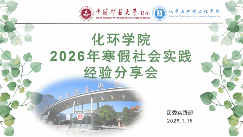 青春在实践中闪光,使命在担当中践行。为深入学习贯彻习近平新时代中国特色社会主义思想,落实立德树人根本任务与实践育人工作要求,化环学院紧扣“能源报国 挺膺担当”主题,立足专业特色,将“劳动+”育人理念融入实践全过程,引导青年学子在社会课堂中受教育、长才干、作贡献,扎实完成2026年寒假社会实践各项工作。
