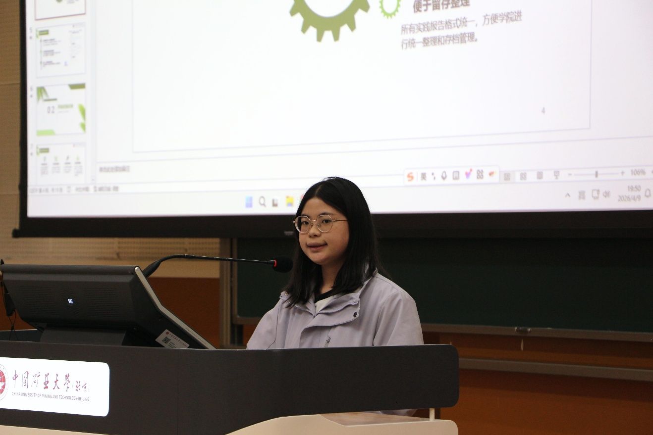 石江语结合自身社会实践经历,带来社会实践全流程干货分享。她围绕报告撰写的逻辑框架、实践过程的详细记录、关键要点的精准把控以及实践成果的提炼升华,细致拆解了社会实践各环节的规范要求与实操技巧,着重强调了实践过程中资料留存的完整性和成果宣传的必要性。同时结合自身专业实习经历,分享了运用化工专业知识助力基层政务工作的经验,叮嘱同学们在实践中发挥专业所长、严守纪律规范。她号召大家主动走出校园,在基层实践中锤炼本领,以实干实现青春价值。