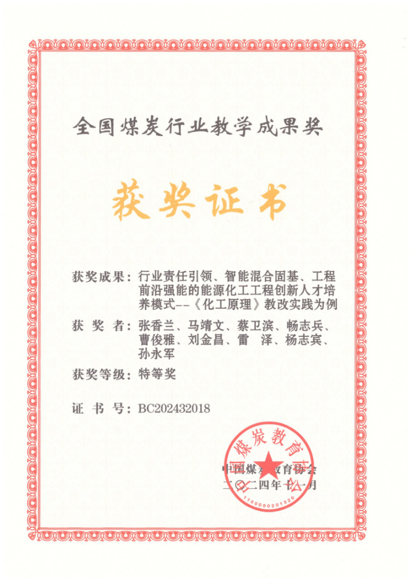 成果名称:行业责任引领,智能混合固基、工程前沿强能的能源化工工程创新人才培养模式 —《化工原理》教改实践为例
