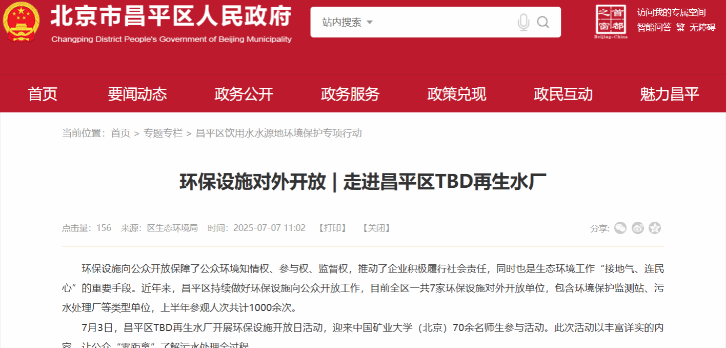 7月3日,在陆兆华教授、张萌老师的带领下,24级本科生来到了我校科技矿场-昌平区TBD再生水厂。在工作人员的带领下,学生先后参观预处理区、厌氧区、缺氧区、好氧区、MBR膜池区、污泥处理间等地,学生对全地下式的污水处理构筑物以及污水深度处理工艺有了较深的理解。此次活动得到北京电视台及昌平区生态环境局的支持,并在北京电视台新闻频道与昌平区人民政府官网进行了报道。