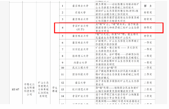 由苏佩东、张萌、陈旭老师指导,孙艺菲等同学完成的参赛项目 《点“绿”矿山,“碳”索未来:基于煤基固废资源化和林草碳汇的矿山生态修复技术研究》 ,凭借其 “四维一体” 的集成技术创新,成功实现了煤基固废的高效资源化利用,构建起矿山生态修复与林草碳汇协同发展的新路径,从众多优秀作品中脱颖而出,获得大赛特等奖。