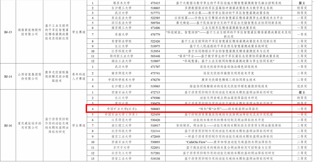 由刘骞、刘金昌、林雄超老师指导,李又旺、张思怡等同学完成的参赛项目 《“碳粒”解“油稠”—纳米碳基稠油降粘剂》 ,首创由煤炭一步刻蚀合成优质的碳纳米颗粒路线,经绿色氧化修饰后,与表面活性剂复配成降粘剂,实现了稠油油藏低成本、高效益的开发,荣获大赛一等奖。
