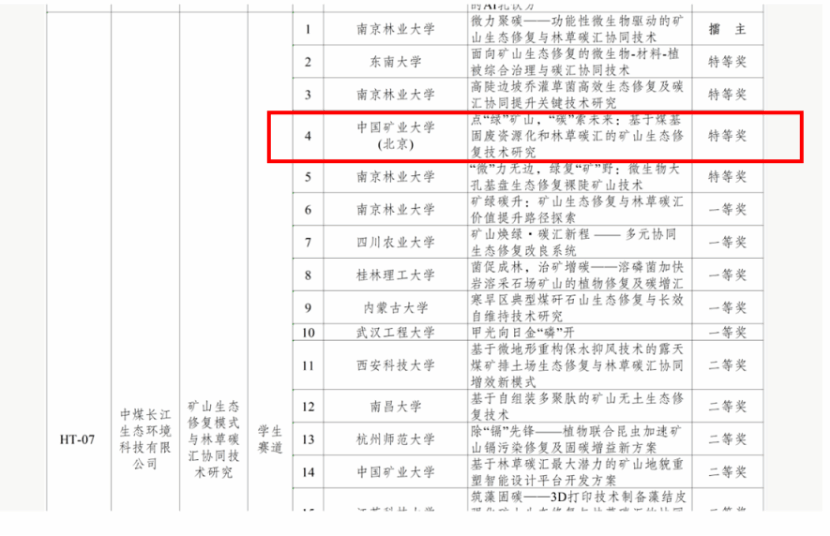 由苏佩东、张萌、陈旭老师指导,孙艺菲等同学完成的参赛项目 《点“绿”矿山,“碳”索未来:基于煤基固废资源化和林草碳汇的矿山生态修复技术研究》 ,凭借其 “四维一体” 的集成技术创新,成功实现了煤基固废的高效资源化利用,构建起矿山生态修复与林草碳汇协同发展的新路径,从众多优秀作品中脱颖而出,获得大赛特等奖。